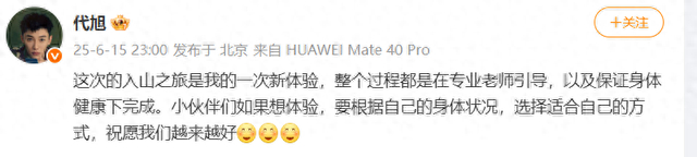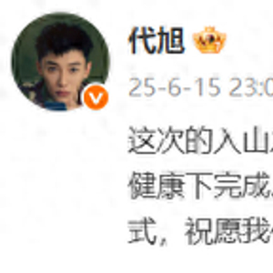 15日深夜,代旭发文回应称,“这次的入山之旅是我的一次新体验,整个过程都是在专业老师引导,以及保证身体健康下完成。小伙伴们如果想体验,要根据自己的身体状况,选择适合自己的方式,祝愿我们越来越好。”