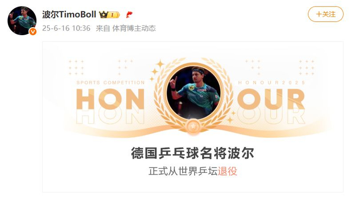 6月16日上午,波尔的个人微博动态更新,显示“德国乒乓球名将波尔正式从世界乒坛退役”。