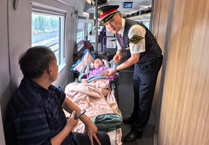 12时15分,王飞在巡视完车厢后,来到大叔身边。通过了解得知,董大叔今年65岁,躺在轮椅上的是他的妻子,患有神经性疾病多年,此次是前往河南平顶山为妻子寻医看病。王飞为大叔送上了茶水和加热好的盒饭。14时42分,列车驶入平顶山西站。在王飞与车站工作人员的帮助下,轮椅被安全地抬下车,董大叔与家人在工作人员的引导下出站。(翟祚珩)