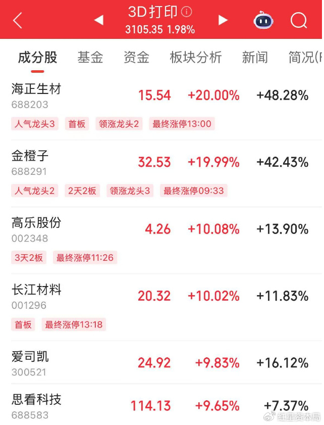 红星资本局6月16日消息,今天A股盘中,3D打印概念板块出现异动拉升,金橙子(688291.SH)开盘3分钟斩获“20CM”涨停,午后海正生材(688203.SH)也收获20CM涨停。