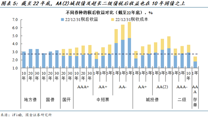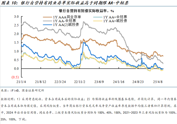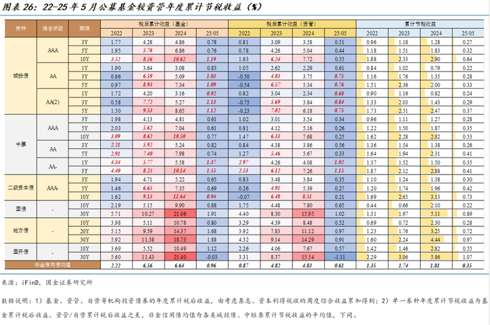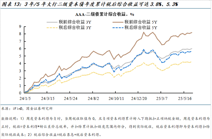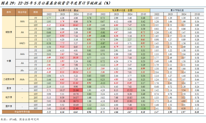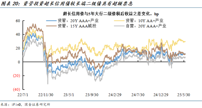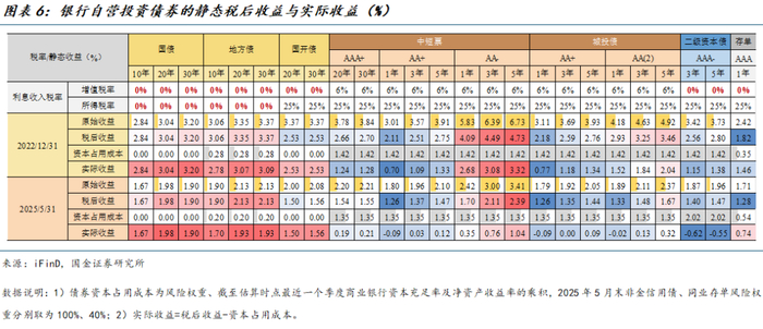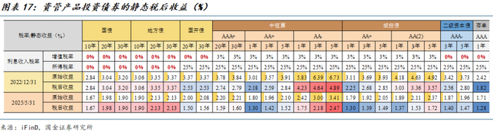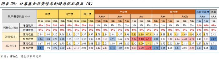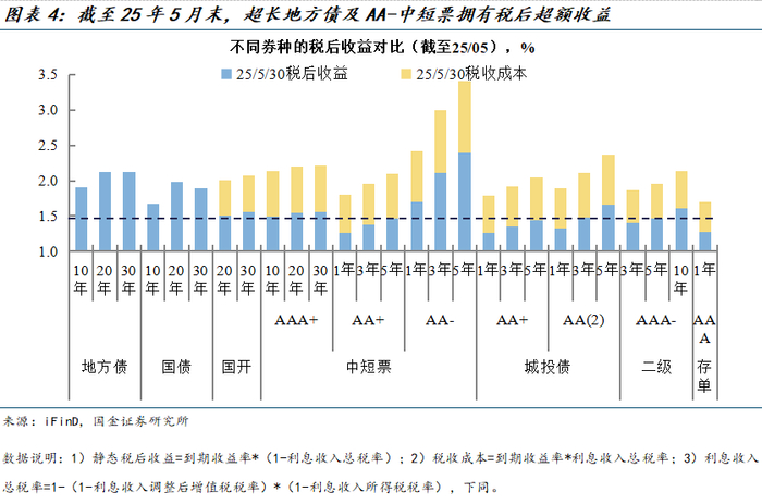国债及地方债免税政策赋予其超额票息优势。出于较低的风险偏好以及节税因素,银行自营部门重仓地方债及国债,截至2025年4月,两者配置比例达到44%、27%。如果仅考虑票息收益税收,2025年5月末,10年及以上地方债、AA-中短票税后收益高于10年国债,10年以上地方债超额收益约45bp,而3-5年AA-中票超额在40-70bp左右。反观2022年年末,AA(2)城投债、5年以上二级资本债静态税后收益同样优于10年国债。
