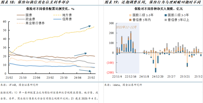 在免税优惠下,2025年5月末,20年国债、地方债较同期限国开债具有55bp左右的超额收益,票息优势明显,同时,二永债及多数高等级、中短久期普信债税后收益不及10年国债。2022年12月,5年期大行二级资本债税后收益走高至10年国债附近,为保险提供了逢高配置的机会,然而今年5月底,两者利差处于-20bp的偏低水平,过去一年保险减持商业银行债甚至超过30%。对于普信债,增值税减半使得保险投资AA-中短票、5年AA(2)城投债较利率品种仍有超额票息,不过保险持债风险偏好较低,收益吸引并不是保险首要考虑因素。
