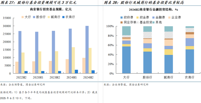 基金投资债券的税收优惠,使其吸纳了大量银行自营委外资金。根据企业预警通数据,截至2024年末,商业银行可比有效样本投资基金规模约5.8万亿元(实际规模或高于该数据),其中大行、股份行、城商行及农商行投资金额分别为1万亿、3万亿、1.6万亿与0.2万亿,股份行与城商行自营的基金投资规模在金融投资中占比较高。