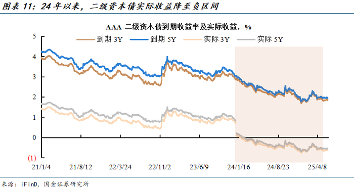 实际收益的概念也存在一定局限。资产的风险越大,风险权重越高,也有更大的机会获得高额收益,如果单纯以实际收益为标准,集中投资于低风险资产,那么整体收益率可能达不到计算机会成本时假定的ROE水平。另一方面,上述计算是仅考虑票息税收的静态假设,并未纳入资本利得收益的部分。以二级资本债为例,2024年《商业银行资本管理办法》落地后,商业银行次级债风险权重由100%上调至150%,各期限AAA-二级资本债实际收益在当年1月普遍降至负区间,然而这并不等同于交易二级资本债无利可图。