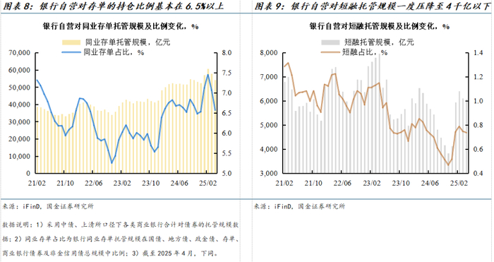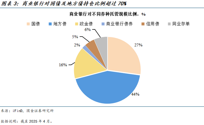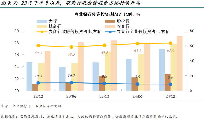 国债及地方债免税政策赋予其超额票息优势。出于较低的风险偏好以及节税因素,银行自营部门重仓地方债及国债,两者合计持仓比例超过70%。截至2025年5月末,10年及以上地方债、AA-中短票静态税后收益仍高于10年国债。然而考虑资本占用成本后,即使5年AA-中票实际收益也远不及长久期利率债,实际收益缩水致使中小行以政府债替换信用仓位,2023年至2024年末,农商行的政府债投资占比升高至63.6%。