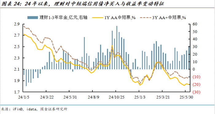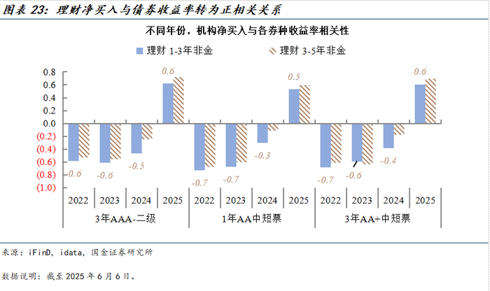 下沉策略税后收益缩减,或导致理财交易属性凸显。同样作为资管产品,理财过去偏好短债下沉策略做收益,但税后2.2%以上债券品种已经偏少,即使增厚票息匹配2.2%-2.3%左右的业绩基准下限也不易,理财转向交易盘做收益。今年以来,理财对1-3年非金信用债净买入与信用债收益率呈正相关关系,与过去情形相左。当收益率抬升时,理财出现部分买盘,而在收益下行时或有一定卖出获取资本利得。除了强化信用波段操作外,理财增加部分存单、利率债配置,既有应对低收益的考虑,也是用仓位流动性防范负债端压力。