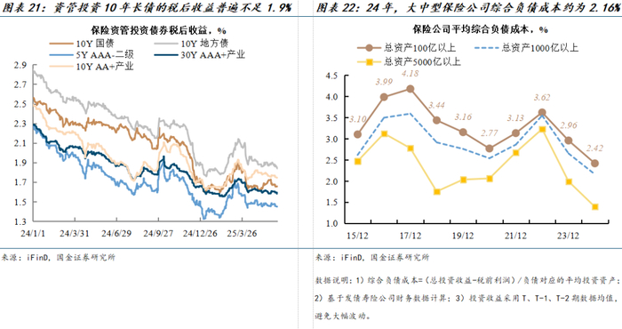 长期中,信用债税后超额票息减小,保险资管切换信用仓位至超长国债与地方债。在部分交易型机构看来,利率债流动性更好,适合作为交易品种赚资本利得,但对于保险配置盘,这种仓位变化趋势,主要是考虑资产收益与负债端成本的匹配度。