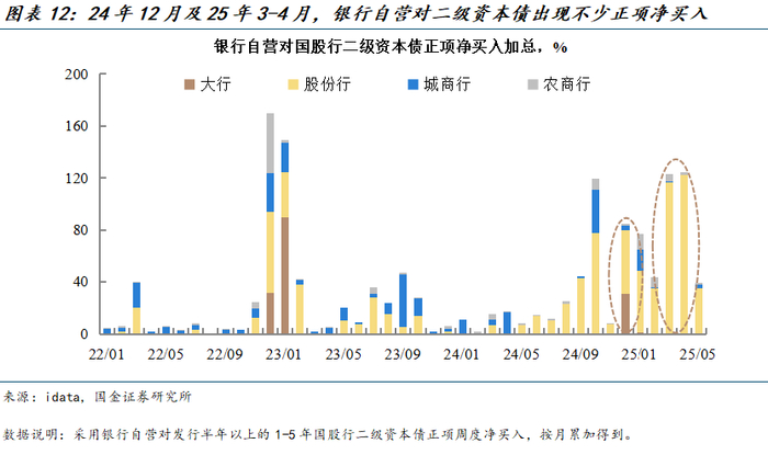 流动性属性增强下,银行交易二级资本债力度加大。城农商行自营倾向于在二级资本债调整时买入,两类机构在2022年12月、2023年9月及2024年10月的二级债正项净买入分别达到75.8亿元、41.2亿元和41.8亿元,是2022年以来取值最大的三个月,这也是各年内回调较大的时点。对于股份行自营,除收益逢高买入的操作逻辑外,随着二级资本债流动性的提升,该品种成为牛市中执行波段策略的合意标的,去年12月前两周,股份行自营对国股行二级债增持规模达到25.9亿元、15.1亿元,极致利率牛市行情中,追逐长二永力度不弱,而今年3月及4月中下旬也有类似情形出现。