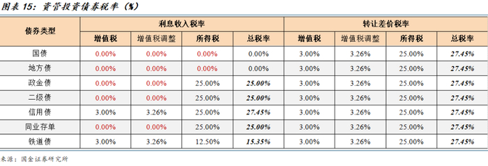 资管投资债券时享有税收优惠。对于银行理财、信托、基金、证券及保险资管等资管产品管理人,其增值税均按照3%的税率缴纳,该税率同样需要进行价外调整,并考虑附加税的部分。相对特殊的是基金,早在2008年,《关于企业所得税若干优惠政策的通知》中就有规定,对证券投资基金所获债券利息收入和差价收入,不收取企业所得税;2016年,营改增试点通知减免基金买卖债券所得转让收入的增值税;2017年12月的增值税估值参考意见中进一步说明,基金持有债券取得的应税利息收入,应按日计提增值税。