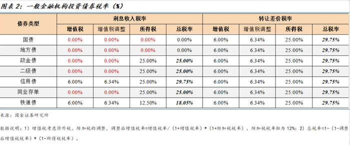 对于一般金融机构,投资债券过程中主要征收两类税项:增值税和所得税。企业所得税税率为25%,且应纳税金额包括转让收入和利息收入,其中国债、地方债利息收入免税,铁道债利息收入减半征收。增值税税率为6%,债券投资涉及的应税金额包括:1)金融商品持有期间的利息收入、2)转让有价证券收入。其中,国债、地方政府债及金融同业往来的利息收入免征增值税。
