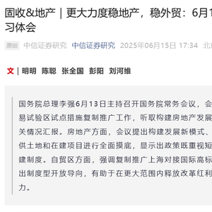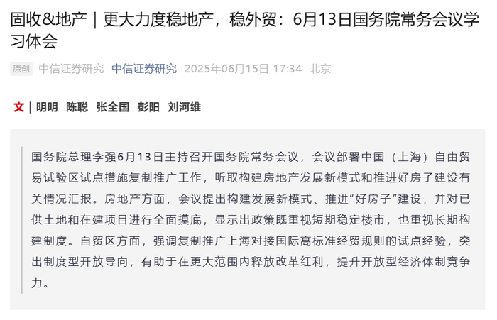 在内外部经济形势承压背景下,宏观政策正持续加力。6月13日召开的国务院常务会议,在部署推进上海自贸区改革试点复制推广的同时,明确提出“构建房地产发展新模式、推进‘好房子’建设”,并强调对已供土地和在建项目的全面摸底。这一表述被市场解读为政策力度升级的直接信号,稳地产与稳外贸并重,为下半年经济运行注入更多确定性。