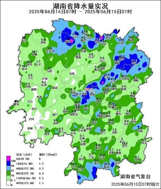 据湖南省气象台此前的实况预报显示,6月14日7时至15日7时,娄底、长沙、张家界、岳阳、益阳、常德、邵阳、永州、衡阳、郴州、湘潭、株洲12市(州)33县(市、区)125乡(镇)出现暴雨,娄底(涟源)、长沙(宁乡)、张家界(慈利)、岳阳(华容)4市(州)4县(市、区)4乡(镇)出现大暴雨。