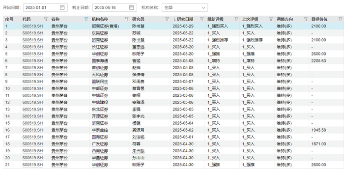 Wind显示,今年以来贵州茅台共获得92次评级,主要包括“买入”、“强推”、“增持”三大类,对比此前券商评级多维持不变。