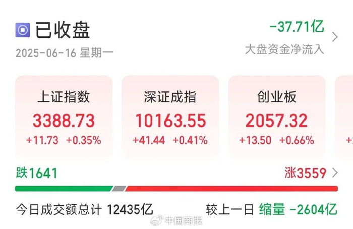 中国商报(记者 马文博)6月16日,A股三大指数集体上涨。截至收盘,沪指涨0.35%,深成指涨0.41%,创业板指涨0.66%,北证50指数涨1.84%。全市场成交额为12435亿元,较上一日缩量2604亿元。全市场超3500只个股上涨。在板块题材上,蚂蚁金服概念、游戏、影视院线、跨境支付板块涨幅居前,贵金属、毛发医疗板块跌幅居前。