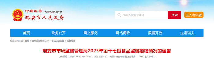 浙江省瑞安市市场监督管理局2025年第十七期食品监督抽检情况的通告