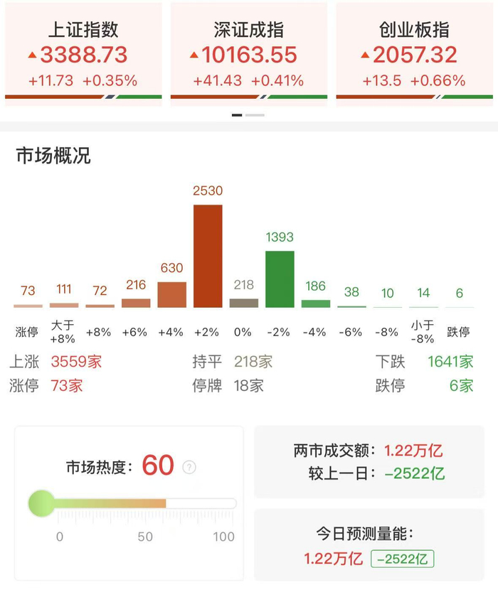 财联社6月16日讯,市场全天震荡反弹,创业板指领涨。沪深两市全天成交1.22万亿元,较上个交易日缩量2522亿元。盘面上,市场热点快速轮动,个股涨多跌少,全市场超3500只个股上涨。从板块来看,IP经济概念全天强势,光线传媒等多股涨停;稳定币概念再度走强,协鑫能科、恒生电子等涨停;化工板块反复活跃,金牛化工等涨停;下跌方面,足球概念震荡调整,共创草坪逼近跌停。截至收盘,沪指涨0.35%,深成指涨0.41%,创业板指涨0.66%。
