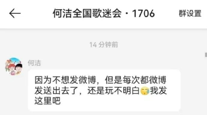 何洁在粉丝群回应秒删,原因是:“不想发微博,但是每次都微博发送出去了,还是玩不明白。”