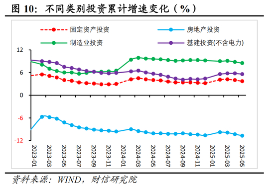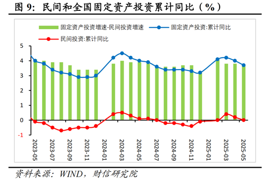 固定资产投资和民间投资增速均放缓。1-5月份固定资产投资同比增长3.7%,较1-4月回落0.3个百分点(见图9);5月份环比增长0.05%,较4月份大幅回落0.43个百分点,创去年8月份以来新低,显示出投资端动能走弱明显。其中民间投资累计增速回落0.2个百分点至0%,与整体投资的差距小幅收窄至3.7%(见图10),但继续处于历史高位区间,民营企业“不敢投、不愿投”现象持续,房地产市场走弱、价格持续低迷以及对美出口大幅下降均对民营企业投资意愿形成压制,政策宜进一步加大对上述薄弱环节的支持力度。分结构看,1-5月份三大类投资增速呈现出“基建制造业支撑减弱、地产降幅扩大”的同步放缓特征(见图10),外需受到关税冲击、国内增量政策出台预期降低以及内需不足矛盾进一步凸显,对微观主体投资扩产能力和意愿构成明显制约,是主要原因。