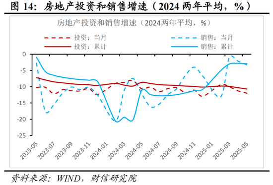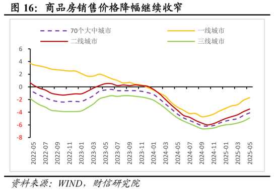 领先指标预示投资增速处于筑底阶段。一是房企融资压力有所加大,如2025年5月房地产资金来源累计同比下降5.3%,降幅较4月份扩大1.2个百分点,在低基数作用下降幅扩大,说明房企融资压力有所加大。二是土地市场出现分化,一、二线好于三线,民营房企拿地意愿仍偏低。如5月100个大中城市、一线、二线、三线城市成交土地面积累计增速分别为-10.3%、-7.4%、-0.3%、-15.0%,其中,一、二线城市降幅收窄较多,为12.0、3.7个百分点,三线城市降幅仍在扩大,为1.4个百分点,一、二线城市活跃度明显好于三线城市。同时,成交土地溢价率较4月明显下降,表明房企购地能力和意愿仍然偏低。三是作为房地产投资领先指标的房地产销售面积降幅小幅扩大,未来房地产投资增速继续筑底的可能性较大,企稳需政策力度进一步加大。