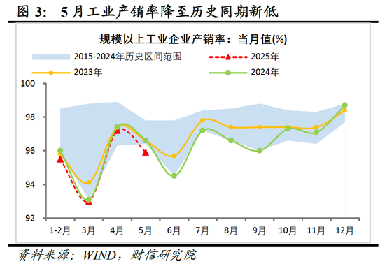 工业生产继续有韧性地放缓,原因有三:一是投资、出口需求放缓较多,对生产的带动作用明显减弱,如1-5月份投资、出口增速分别较1-4月回落0.3和0.4个百分点,拖累上中下游制造业生产增速多数回落(见图2)。二是国内“供强需弱”矛盾突出,加上中央加强综合整治“内卷式”竞争,一定程度上制约了生产的回升。如5月规上工业企业产销率再度回落,创下历史同期最低水平(见图3),表明经济“供强需弱”问题仍未有效改善,将持续对生产活动形成钳制作用。三是新动能的支撑作用仍偏强,如受益于“两新”政策加力扩围和产业升级等的带动,5月份装备制造业增加值增长9%,高于全部规上工业3.2个百分点,贡献率高达54.3%(2024年装备制造业营收占规上工业的比重仅41.3%)。