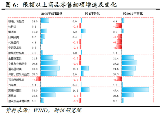 一是以旧换新政策带动作用显著。5月份限额以上单位家用电器类、通信器材类、文化办公用品类、家具类、建筑装潢类商品零售额同比分别增长53%、33%、30.5%、25.6%、5.8%(见图6),五者合计拉动社零增长1.9个百分点,比上月提高0.5个百分点(见图7)。二是中低收入群体消费有所恢复。5月份代表中低收入群体消费的限额以下商品零售增速,较上月增加1.3个百分点,拉动社零增长2.7个百分点,比上月提高0.6个百分点(见图7)。中低收入群体消费回升,一方面或与批发零售、住宿餐饮业生产加快,年内基建投资保持较快增长,带动相关就业改善相关;另一方面财政加大惠民生、促消费力度,商家推出“以价换量”策略,过去基数偏低等也均是重要原因。三是“五一”、“端午”假期带动服务消费好转。如5月份餐饮收入增速较上月提高0.7个百分点至5.9%,对社零的拉动较上月提高0.1个百分点(见图7);1-5月份服务消费零售增速为5.2%,较上月提高0.1个百分点。四是“6.18”促销、居民高品质生活需求增加,推动部分升级类商品保持较快增长。5月份限额以上体育娱乐用品类、烟酒类、金银珠宝类商品零售额均保持双位数增长,前两者增速较上月分别提高5.0和7.2个百分点(见图6)。此外,本月汽车消费增速较上月提高0.4个百分点至1.1%,也有利于社零的改善。