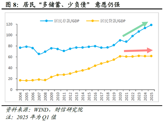 往后看,消费温和增长可期,修复高度不宜过度高估,预计全年社零约增长5%。一是受益于宏观政策加大逆周期调节和政策着力点更多转向惠民生、促消费,预计政府消费托底作用增强,对社零改善形成重要支撑。二是受外部不利影响仍大,部分企业生产经营困难增加、盈利能力下降影响,预计民间投资与居民谨慎预期扭转需要更多的时间,“就业-收入-消费”循环畅通和居民“多储蓄、少负债、少消费”的行为模式扭转均难以一蹴而就(见图8),消费修复力度或仍偏温和。三是受高基数和前期透支效应影响,预计以旧换新政策对社零的拉动作用大概率边际减弱,给未来社零增长带来一定压力。四预计2025年名义居民人均可支配收入约增长4-5%,略高于名义GDP增速;同时假定国内居民边际消费倾向,可以恢复至与2024年水平基本相当,据此测算出社零增速可以接近5%左右。
