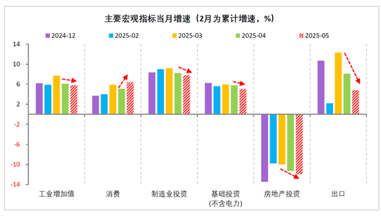 受中美谈判结果好于预期、政策组合效应持续释放,但国内新旧动能转换存在阵痛等因素叠加影响,5月份主要供需指标总体保持韧性但表现分化,工业、服务业生产、消费好于预期,房地产投资、民间投资以及通胀指标再度走弱,经济回升向好的内生动能尚需巩固和增强。综合看,上半年GDP实现5%以上增长基本无虞,短期增量政策或不急于出台,但政策重心宜更加聚焦稳楼市、稳就业、稳物价等经济薄弱环节加力,同时建议储备万亿元以上的增量政策,以对冲下半年可能的出口下行和内需持续偏弱风险。预计二季度GDP增长5.3%左右,全年约增长4.9%。