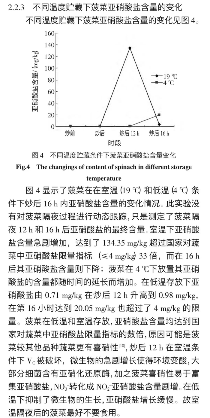 有研究显示,菠菜 4 度冷藏 16 小时后,亚硝酸盐就超过国家限量,所以别吃隔夜菠菜。[7]