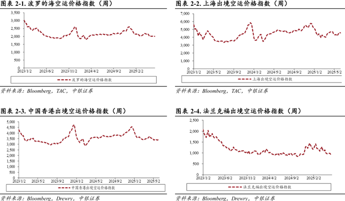 航空货运价格:截至2025年6月9日,上海出境空运价格指数报价4567.00点,同比-5.0%,环比-0.9%。波罗的海空运价格指数报价2008.00点,同比-4.8%,环比-0.9%;中国香港出境空运价格指数报价3433.00点,同比-7.6%,环比+0.8%;法兰克福空运价格指数报价903.00点,同比+0.7%,环比-1.7%。