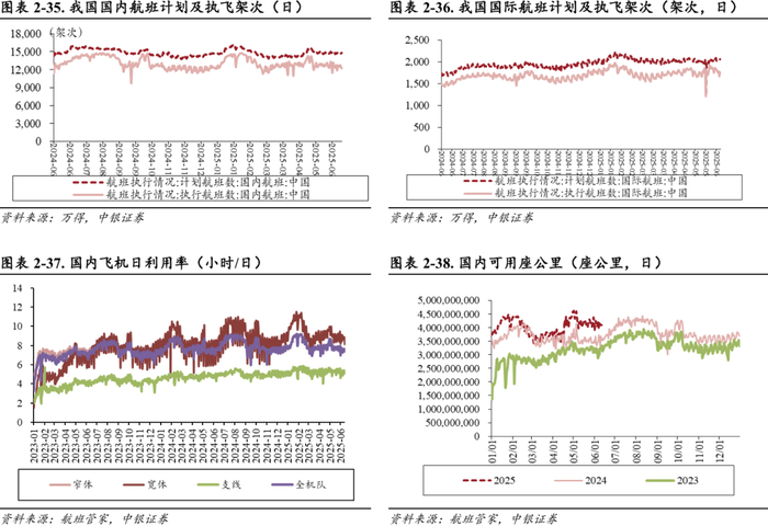 国内飞机日利用率环比上升。2025年6月7日﹣2025年6月13日,中国国内飞机利用率平均为7.51小时/天,较上周日均上升0.04小时/天;窄体机利用率平均为7.53小时/天,较上周日均上升0.05小时/天;宽体机利用率平均为8.69小时/天,较上周日均值下降0.02小时/天。
