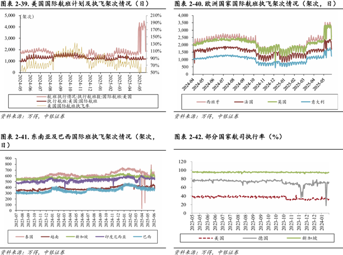 2025年4月吉祥、春秋、国航、南航、东航、海航ASK已超19年同期。可用座公里(ASK)方面,2025年4月,南航、国航、东航可用座公里分别相对去年同比增长9.05%、5.34%、9.65%,恢复至19年同期的123.90%、170.81%、147.57%;吉祥、春秋、海航3月可用座公里恢复至19年同期的132.93%、123.38%、143.16%,已远超疫情前水平。收入客公里(RPK)方面,南航、国航、海航、吉祥4月收入客公里分别同比+0.80%、+12.33%、+8.61%、+10.33%,南航、国航、海航、吉祥已恢复至19年同期的103.30%、181.84%、240.38%、177.06%。
