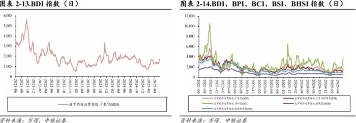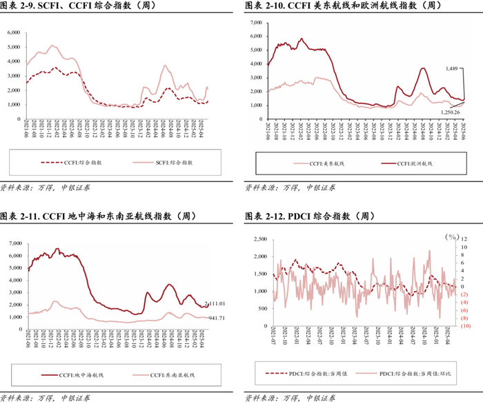 干散货:BDI指数环比上升,报收1968点。2025年6月13日,波罗的海干散货指数(BDI)报收1968点,周环比+20.51%,同比-7.90%,分船型看,巴拿马型、海岬型、轻便型、轻便极限型运价指数分别报收1401/3722/604/936点,环比+12.44%/+30.96%/+0.67%/+0.32%,同比-32.19%/+10.42%/-15.11%/-28.60%。我们认为BDI中长期走势需要观察全球工业经济恢复情况,可以持续动态跟踪世界钢铁产量、澳大利亚和巴西铁矿石出口、中国煤炭进口等指标。