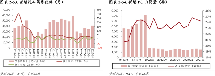2025年Q1,联想PC电脑出货量达1520万台,同比上升10.95%,市场份额环比下降0.3pct。据IDC测算,2025年第一季度全球PC出货量同比增长4.9%,联想市场份额为24.1%,环比下降0.3pct。