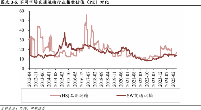 我们选择[HS]工用运输指数和[SW]交通运输指数进行对比,截至2025年6月13日,上述指数的市盈率分别为17.01倍、13.68倍。