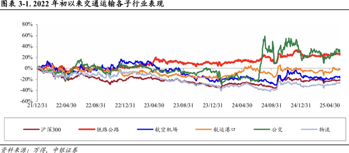 年初至今:2025年初以来,上证综指、沪深300累计涨跌幅分别为+0.75%、-1.80%,交通运输指数-1.10%;交通运输各个子板块来看,铁路公路-4.04%、航空机场-6.97%、航运港口-0.37%、公交+1.34%、物流+6.23%。