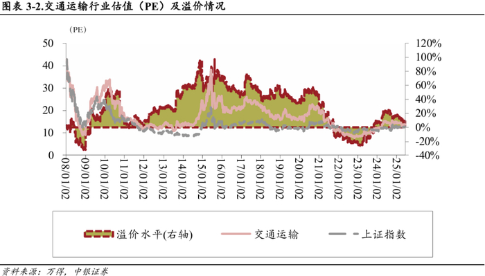 截至2025年6月13日,交通运输行业市盈率为13.68倍(TTM),上证A股为12.67倍。