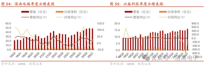 载板:AI算力芯片放量带动行业明显回暖,国内高端载板有望取得新突破。进入25年随着AI算力芯片出货逐步放量,全球ABF载板产能稼动率快速提升,台系载板三雄欣兴、景硕、南电营收逐月向上,4月三家合计营收同比+20%,而台股IC载板4月总产值同比+30%,已连续3个月保持两位数增长。展望后市,随着AI GPU新品拉货动能延续至25H2,叠加800G交换机将于Q3开始放量,预计全球ABF载板供需平衡有望于25年年底实现,优于此前市场预期。而国内ABF载板产能均已建成投产,目前深南、兴森等头部厂商正加速推进国内外核心客户的新品打样认证工作,行业整体进展顺利,有望于今年逐步放量。
