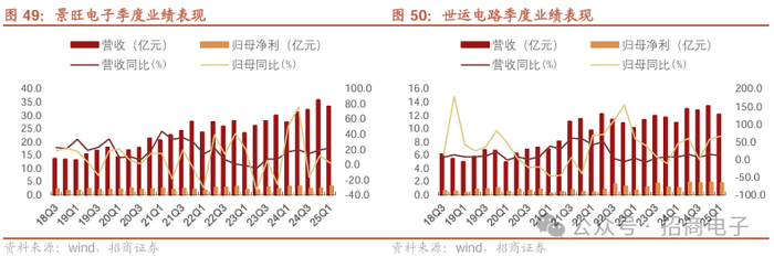 世运电路:汽车智驾领域高端产品有望持续放量,推动产品结构优化。25Q1收入12.2亿元同比+11.3%,归母净利1.8亿元同比+65.6%,毛利率22.7%同比+2.2pct,净利率14.1%同比+4.7pct。公司深耕汽车电子领域多年,汽车业务占比超过50%,目前已实现对特斯拉、宝马、大众、保时捷、克莱斯勒、奔驰小鹏、广汽、长城等品牌新能源汽车的供货。公司与T客户的合作进一步加深,T客户自2019年起已成为公司最大的汽车终端客户,公司作为其主要PCB供应商,为其提供涵盖电动车三电领域关键零部件产品,同时基于技术同源发展进入其光伏、储能等新产品供应链。24年公司汽车用高速 3 阶、4 阶 HDI PCB 和 HDI 软硬结合板实现量产,主要应用于美国和韩国知名汽车品牌汽车驾驶辅助系统、智能驾驶高速数据运算、通讯系统和车联网相关设备等;耐离子迁移电高压厚铜 PCB 实现量产,可应用于新能源汽车能量管理系统和高压快充充电桩等。在自动驾驶方面,公司紧跟技术发展趋势,成功研发了自动驾驶77GHz毫米波雷达板、4D高精度毫米波雷达板及自动驾驶数据中心服务器用PCB等。
