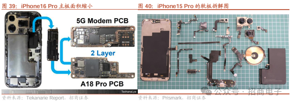 消费电子领域,苹果今明年硬件AI化升级创新以及折叠屏手机望动软硬板量价起升,头部厂商加大资本开支是重要的产业信号。硬板方面,考虑到iPhone的AI化趋势带来的续航需求,且未来苹果亦有进一步轻薄化的趋势,钢壳电池在机内的空间占比会不可避免提升,挤占机内其他模组及主板的空间,我们认为iPhone主板未来的集成度将持续提升,主材、线路设计均有创新升级的需求。而根据Tekanarie Report的数据, iPhone16 Pro的主板采用两层结构,尺寸较15 Pro小了20.7%,集成度再一次提升。展望25-27年新机,我们预计一方面主板所用材料以及加工工艺均会继续升级,此外机内芯片的封装工艺亦可能有所变化从而带动主板的面积和线路设计亦有革新。软板方面,一方面受制于机内物理空间的压缩,软板层数将朝着更高层发展,从目前的2-3层向4-6层发展;另一方面,AI iPhone的功能模块越来越多,如iPhone16 Pro系列新增相机控制按键模组,且光学、声学、显示等模组也在升级,数据传输要求提高,这些均会推动今明年iPhone新机软板的升级迭代,再考虑到26年底或27年初有望发售的折叠屏iPhone,FPC的价值量有望得到较大提升。近期从苹果PCB核心供应商鹏鼎控股的年报中,我们注意到其2025年的资本开支预算较上一年增加了50%以上至50亿元,未来端侧AI化的创新将进一步消耗现有产能,我们认为头部厂商的新一轮扩张是产业创新趋势的佐证,亦是重要的产业信号。