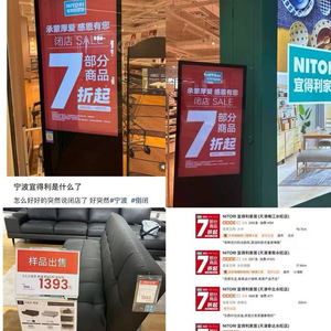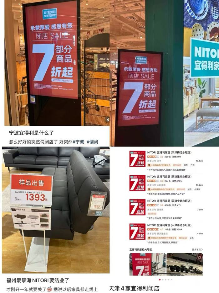 界面新闻自社交平台看到,宜得利家居(NITORI)在福州、宁波、天津、北京等城市关闭了部分门店,其中宁波店在6月15日正式闭店,而北京槐房万达店的宜得利家居已于今年3月闭店,尤其是天津的永旺泰达店、永旺梅江店、中北永旺店以及永旺津南店在今年上半年连续关停。