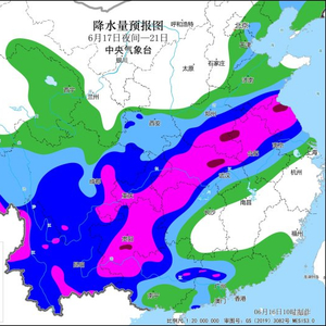 预计17日夜间至21日,西南地区至黄淮、江淮一带有大到暴雨,其中苏皖中北部、河南南部、湖北、湖南西北部、贵州、广西西北部及四川东部、重庆南部、云南西北部的部分地区有大暴雨,局地特大暴雨;上述地区累计降雨量有80~150毫米,局地可达200~300毫米,最大小时降水量20~50毫米、局地70毫米以上。