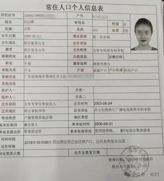 据可信的资料履历显示:胡佳娜2002年入职珠海电视台文艺部担任主持人;2007年停薪留职赴美留学;2009年以投资移民方式获美国绿卡;2014年,以“获取绿卡居留美国满五年整”的条件,快速入籍,成为美国公民。