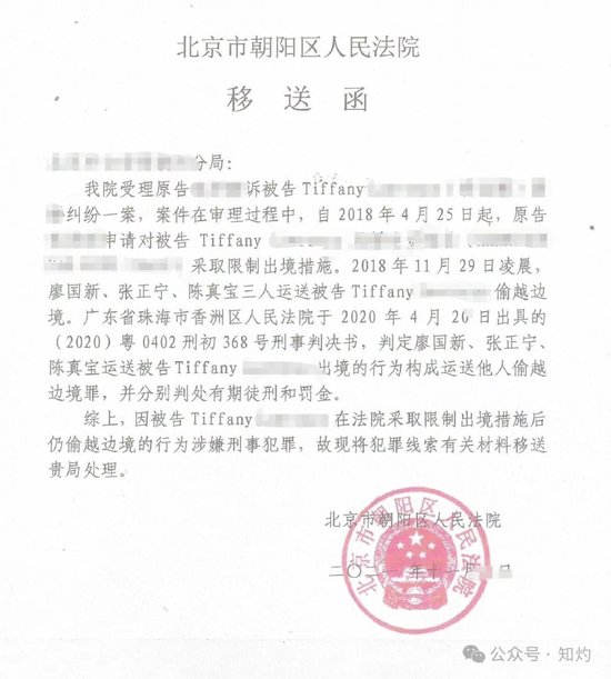 对于这一罕见又棘手的案件,主审法官表示:我们告诉了Tiffany限制出境的原因是民事案,这个美国人为什么非要以刑事犯罪的方式出逃,而且还跑成了?不理解也不妥协的主审法官,认定Tiffany的违法出境行为涉嫌刑事犯罪,于2021年11月向公安机关发出刑事犯罪移送函。