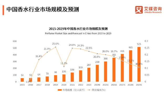 根据艾媒咨询数据显示,2023年中国香水市场规模达207亿元,同比增长22.5%,预计2029年有望达到515亿元。中国香水市场迅速发展,发展增速远高于全球香水市场。艾媒咨询分析师认为,中国香水市场相较于成熟的国际市场,仍处于蓝海阶段。