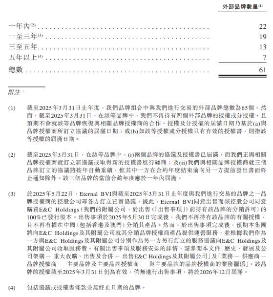 而在颖通的61个外部品牌中,有22个品牌的合约将在一年内到期,19个品牌在一至三年内到期,五年以上的品牌仅有7个。“倘若我们无法与提供货源的该品牌授权商取得合作,则它对我们的产品供应可能会中断。我们也可能因为和该品牌授权商之间的分歧而面临诉讼风险。”颖通控股在招股书中表示。