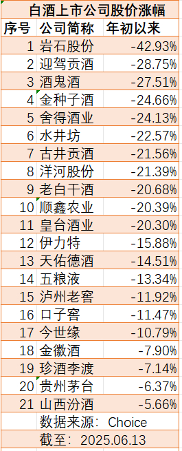 Choice数据显示,截至6月13日收盘,年内跌幅20%以上的白酒公司,总共11家,其中不乏洋河股份(002304.SZ)、古井贡酒这样的二线名酒,以及酒鬼酒(000799.SZ)、水井坊、迎驾贡酒这样的地方名酒。