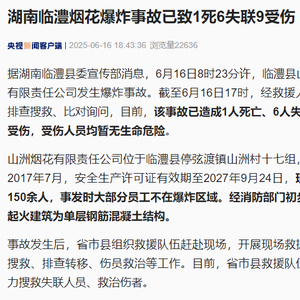 据湖南临澧县委宣传部消息,6月16日8时23分许,临澧县山洲烟花有限责任公司发生爆炸事故。截至6月16日17时,经救援人员现场排查搜救、比对询问,目前,该事故已造成1人死亡、6人失联、9人受伤,受伤人员均暂无生命危险。