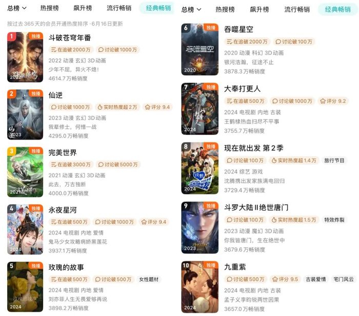 5月18日,《斗破苍穹年番》超越《庆余年第二季》,成功登顶腾讯视频拉新年榜,也让我们再次感受到动漫内容庞大的用户基本盘,对于平台有着“压舱石”一般的战略意义。在腾讯视频拉新年榜TOP 10中,动漫占据了半壁江山。其中,既有《斗破苍穹》《完美世界》这样长情不衰的老牌IP,也有《仙逆》这样跻身TOP 3的“新晋顶流”。不久前上线的《仙逆剧场版》在畅销榜上甚至力压超点的古偶剧《折腰》,足见这部仍处上升期作品的超高人气。