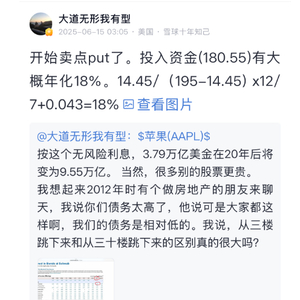 北京时间6月16日,段永平在雪球发文称:“开始卖点put了。投入资金(180.55)有大概年化18%。14.45/(195-14.45) x12/7+0.043=18%。”从晒出的截图看,段永平该笔交易的金额是144万美元。