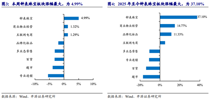 零售各细分板块中,钟表珠宝板块本周涨幅最大;2025年年初至今,钟表珠宝板块涨幅最大。在零售行业各主要细分板块(我们依据二级行业分类,选择较有代表性的超市、百货、多业态零售、专业连锁、商业物业经营、互联网电商、钟表珠宝和品牌化妆品8个细分板块)中,本周3个子板块上涨,其中钟表珠宝板块涨幅最大,周涨幅为4.99%;2025年全年来看,钟表珠宝板块年初至今累计涨幅为37.10%,在零售行业各细分板块中领跑。